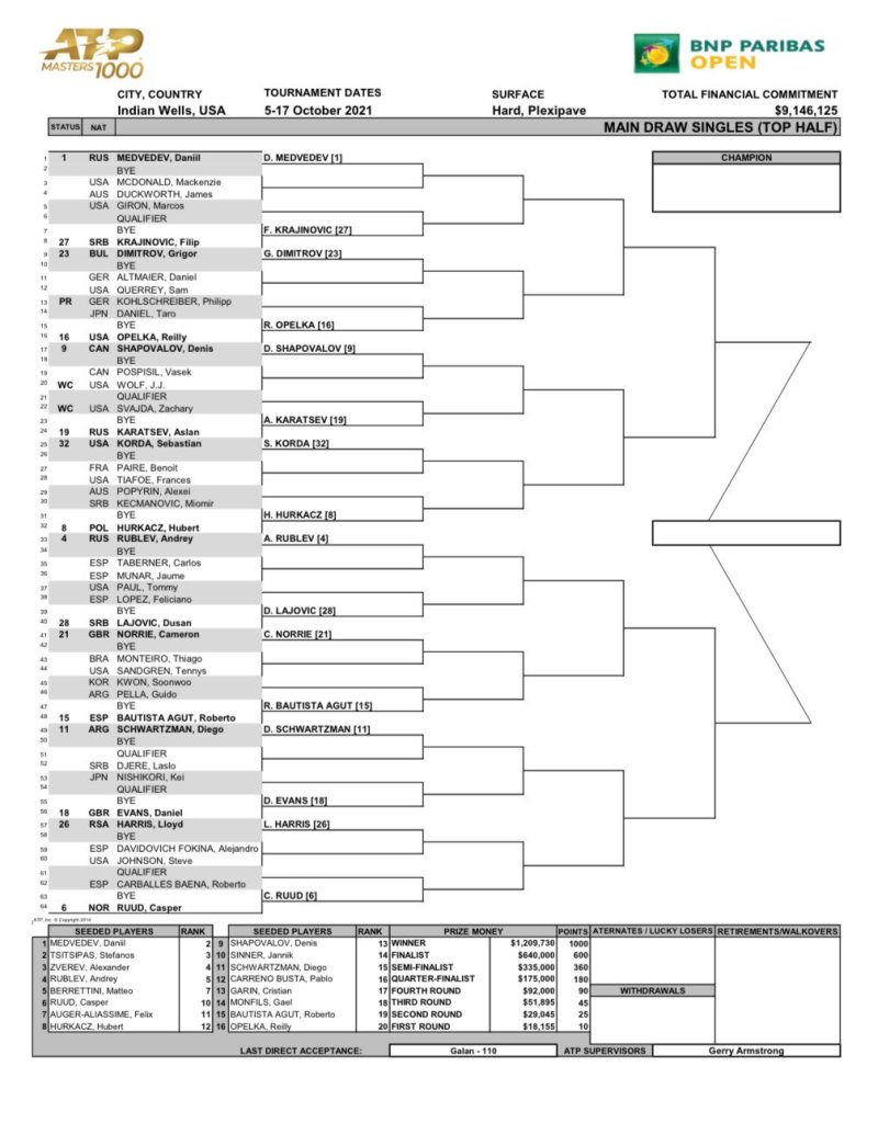 Le Masters 1000 d’Indian Wells débute ce jeudi, en Californie. Le tirage au sort a déjà eu lieu et voici ce qui attend les joueurs tricolores engagés dans ce tournoi. Ainsi, Benoît Paire (n°50) débutera la compétition face à l’Américain Frances Tiafoe (n°49), alors qu’Adrian Mannarino (n°51) affrontera le Britannique Andy Murray (n°121) avant un éventuel affrontement avec l’Espagnol Carlos Alcaraz (n°38). Par ailleurs, Gaël Monfils (n°18), tête de série n°14, sera exempt de premier tour. Il démarrera au deuxième tour, contre le Hongrois Marton Fucsovics (n°42) ou l’Italien Gianluca Mager (n°73). En l’absence du n°1 mondial Novak Djokovic, le Russe Daniil Medvedev (n°2) sera tête de série n°1, suivi du Grec Stefanos Tsitsipas (n°3), de l’Allemand Alexander Zverev (n°4) et du Russe Andrey Rublev (n°5). Le vainqueur de l’US Open pourrait être vu comme un potentiel favori, même si le joueur allemand jouit d’un palmarès déjà bien étoffé en Masters 1000. Quoiqu’il en soit, le tournoi s’annonce plus ouvert que jamais, avec également les absences de Rafael Nadal (n°6) et Roger Federer (n°9).